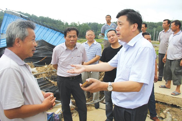 八月八日,华中农业大学教授边银丙(前右一)一行,来到华中农大科研教学基地、曾都区洛阳镇九口堰富民蘑菇专业合作社,慰问菇农,指导灾后生产技术。(通讯员 刘毓 石守京摄)