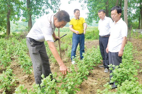 随县高城镇七里塔村老党员刘祖易(左一)发挥共产党员模范带头作用,自费引进杭菊种植,为村民致富提供示范。(本报记者 陈德友摄)