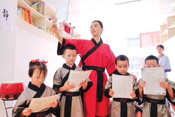汉学国学班暑期受青睐。许多家长让孩子在这里感受国学文化,接受传统礼仪、文化教育。图为孩子们正在童芽蒙正童学馆朗读《弟子规》。 (本报记者 李文军摄)