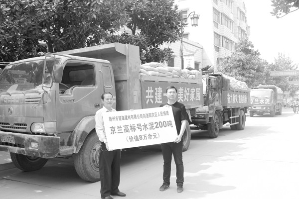 8月25日,随州市楚雄建材有限公司向曾都区洛阳镇捐赠200吨京兰水泥,用于该镇6个村水毁公路以及水利设施的维修与重建。(本报记者 王王景天 通讯员 毛利 摄)