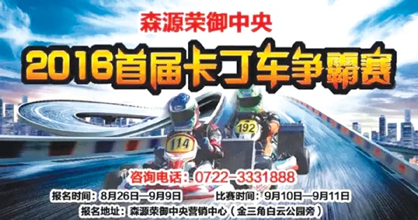 相信我,这个夏天你需要来点不一样的东西!森源·荣御中央2016随州首届卡丁车争霸赛将于9月10日-11日在营销中心前广场激情开赛。在这里,脱离烦闷的工作,脱离一成不变的生活,脱离孩子不知疲倦的吵闹声,化身为极速卡丁车手,体验真正的速度与激情!
