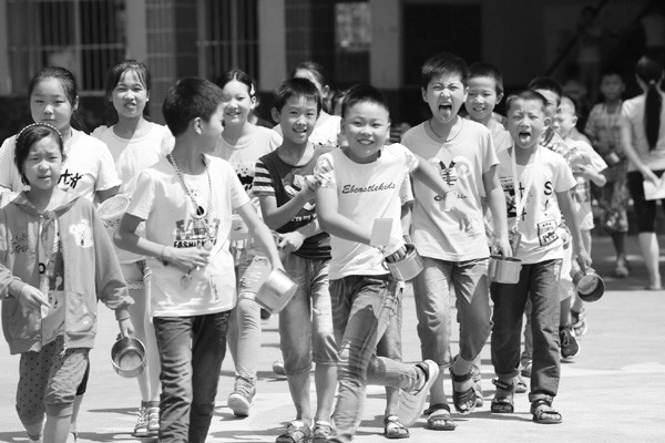 9月1日,灾后的随县柳林二小顺利开学。图为学生们快乐地跑向食堂准备吃午餐。 (本报记者 徐斌 摄)