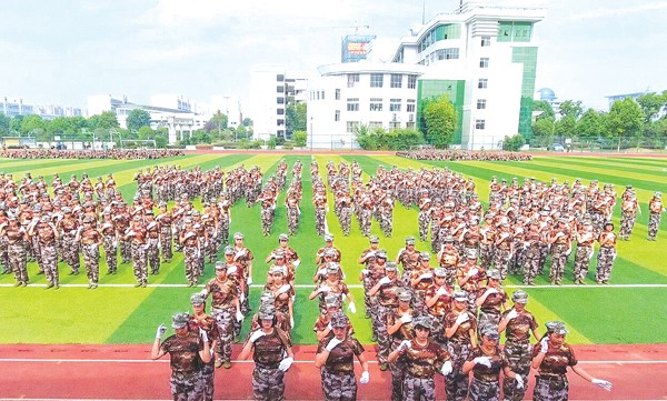 随州技师学院2016级新生军训汇报总结大会上,1200余名新生伴着嘹亮的军歌,迈着整齐的步伐依次展示男女队列、擒敌拳等科目,赢得了现场师生阵阵掌声。(本报记者 李文军摄)