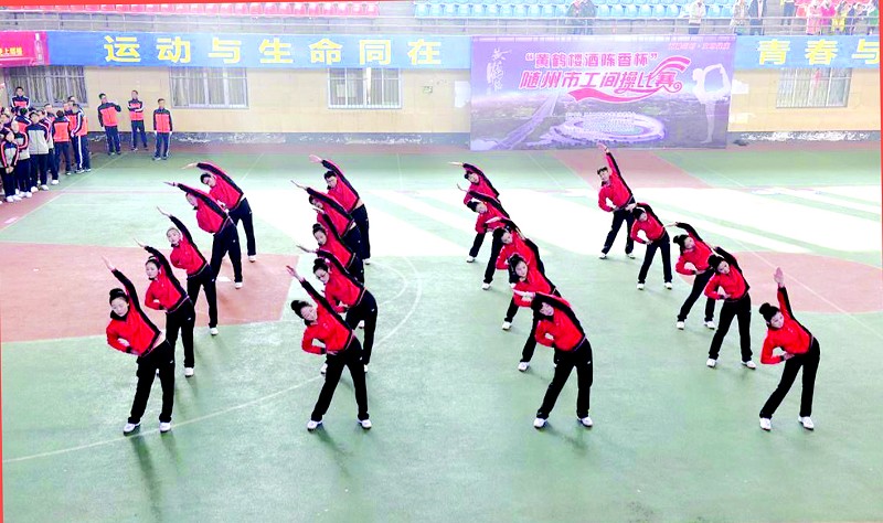 十二月六日,随州市工间操比赛在随州一中体育馆举行,市工商银行代表队以优美的姿势,到位的动作获得一等奖。(通讯员 龚萱摄)