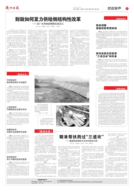 特约记者 吴财荣 通讯员 李映林 马先华 在经济增长下行压力持续加大、财政收支矛盾加剧的情况下,财政部门如何主动作为,有效推进供给侧结构性改革? 日前,广水市财政局局长胡文江在接受记