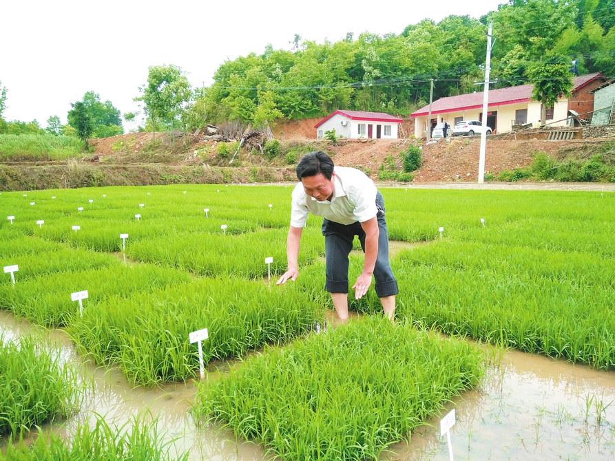武汉大学生命科学学院高级工程师余金洪和科研团队利用大洪山景区长岗镇特殊气候环境,开展绿色超级稻品种选育科研课题项目研究。据悉,绿色超级稻选育是国家级科研课题,项目周期长达15年。(本报记者 王璟天摄)