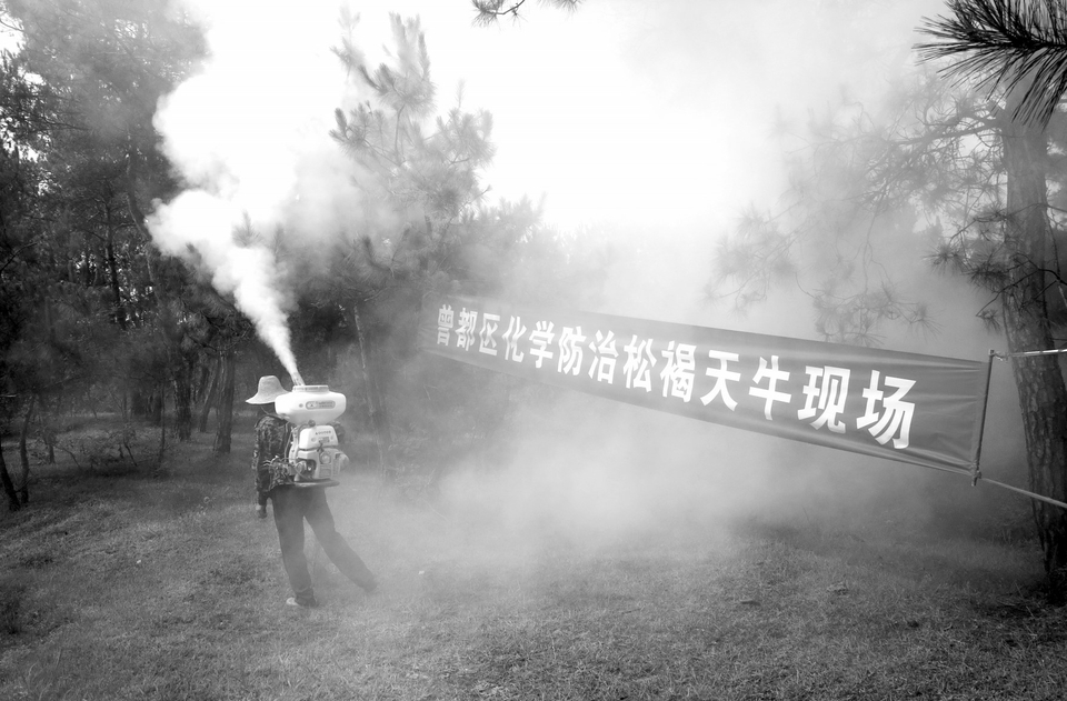 从7月1日起,曾都区林业局森防站组织5台喷粉机,对辖区内2000亩松材线虫病发生区,开展噻虫啉粉剂化学防治,扑杀松材线虫病传播媒介松褐天牛。(本报记者 李文军 通讯员 包俊摄)
