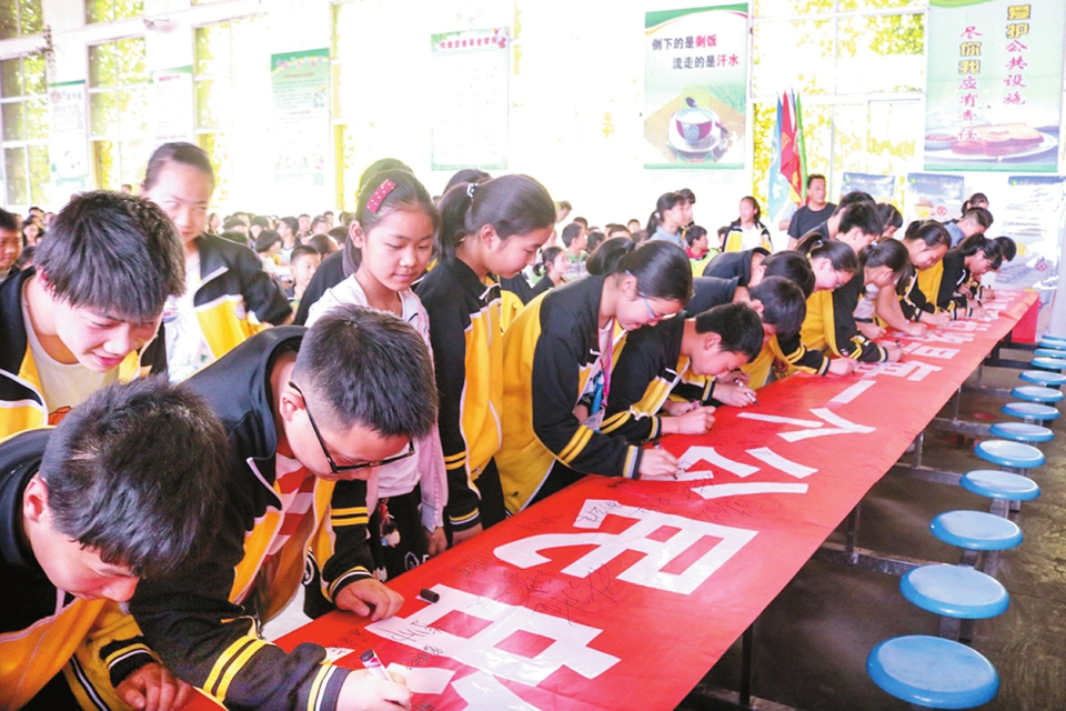 在全市铁路安全宣传月活动中,随州高新区中心学校组织学生开展爱路护路签名活动,旨在全面提升学生们的爱路护路和安全意识。(本报记者 李文军/摄 通讯员 蒋辉/文)