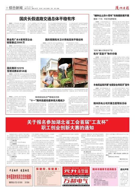 本报讯 记者刘诗诗、通讯员孔会平、李月仙报道:10月8日从市交警部门获悉,国庆黄金周期间,全市道路交通形势总体平稳有序,实现未发生较大交通事故,未发生长时间、大范围交通拥堵的预期工作目标
