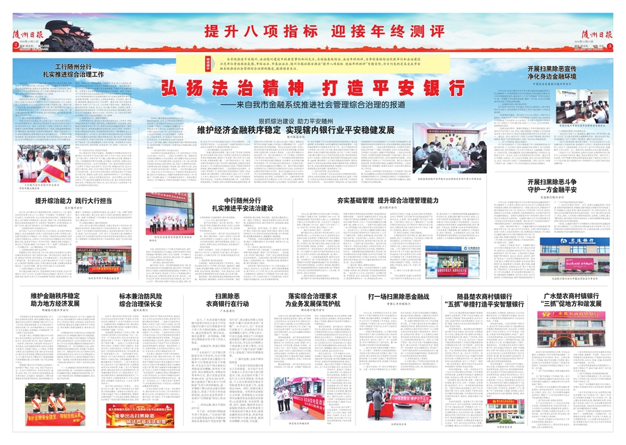 狠抓综治建设 助力平安随州维护经济金融秩序稳定 实现辖内银行业平安稳健发展随州银监分局 2018年,随州银监分局按照综治工作属地管理原则,在市、区两级综治主管部门的指导下,结合随州市2