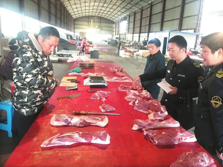 近来,我市食药监执法人员集中检查交易市场、商场、超市等流通环节的猪肉产品质量,严防病死生猪产品流入餐桌,严防非洲猪瘟疫情流入。(随州日报全媒体记者唐天才、通讯员黄琼竹摄)