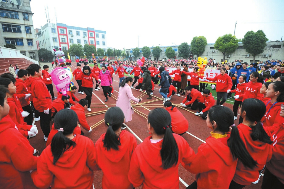 随州市外国语中学将民族体育舞蹈、武术等引入体育课,培养学生爱好体育运动的良好习惯。图为学生和家长一起跳竹杆舞。(随州日报全媒体记者 李文军摄)