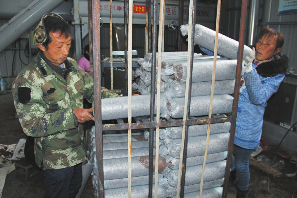 曾都区洛阳镇邱畈村以集中制棒、分户管理的方式发展香菇产业,带动贫困户脱贫。右图为该村新建的30个香菇棚,其中18个菇棚交给贫困户免费使用;下图为1月14日贫困户在年产30万棒的机械化流水生产线上装袋制棒。(随州日报通讯员 金昭宇摄)