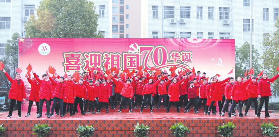 随州市外国语学校汉孟路校区向祖国母亲献礼,庆祝新中国成立70周年,举行了新学期开学典礼,唱红歌、诵诗词,载歌载舞,迎接灿烂新学期。(随州日报通讯员 储韵文摄)