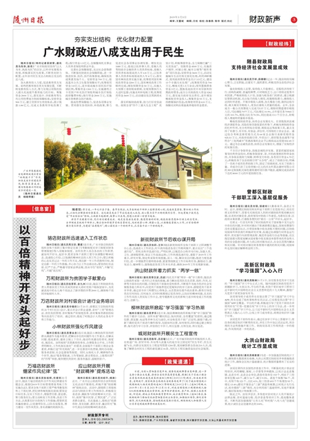 随州日报讯(特约记者吴财荣、通讯员马先华、彭亮)广水市财政局坚持“以人为本、执政为民”的宗旨,以科学发展观为统领,积极落实民生政策,不断优化财力配置,去年该市民生支出占财政总支出的近八成。