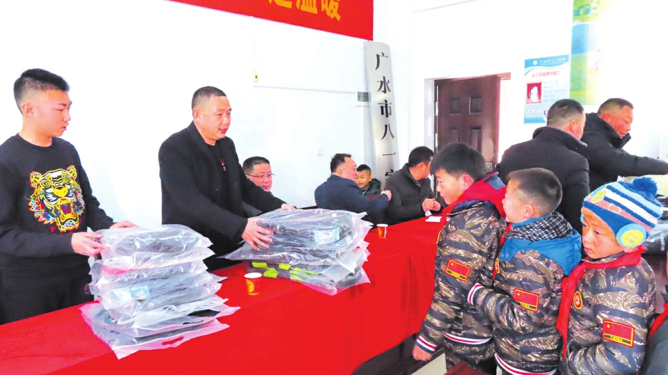 真情助学,春暖校园。近日,中国人大附中学生严昆和父母一起来到广水市八一学校,为在校孤儿、特困生送去关爱。(随州日报通讯员 顾魏摄)