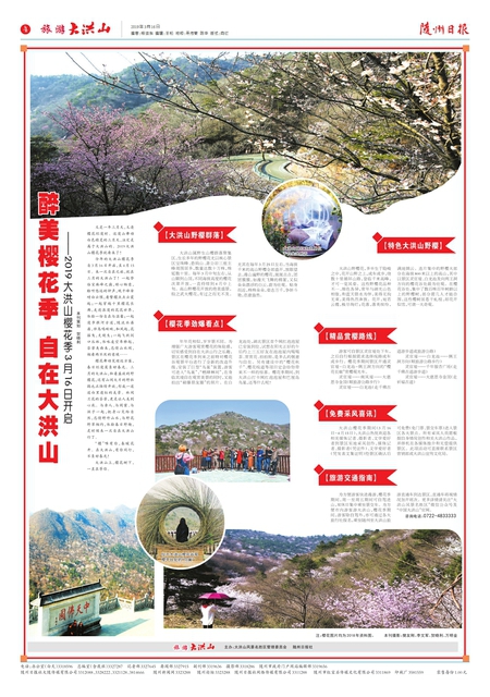 大洪山属野生山樱群落聚集区,生长多年的野樱花尤以核心景区宝珠峰、悬钩山、斋公岩三座主峰周围居多,数量达数十万株,绵延数十里。每年3月中旬左右,从山脚到山顶,不同海拔高度的樱花次第开放,一
