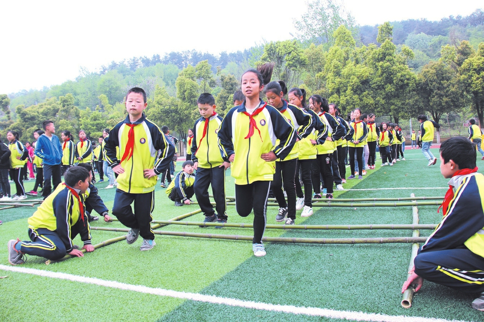为增强学生体质,发展特色体育教育,曾都区洛阳镇高级小学将民俗运动——竹竿舞引进课堂,形成全校学生人人都能跳、部分会花样的局面,丰富了孩子们的课外生活。图为4月10日,该校学生们在阳光大课间跳竹竿舞。 (随州日报通讯员 毛 利摄)