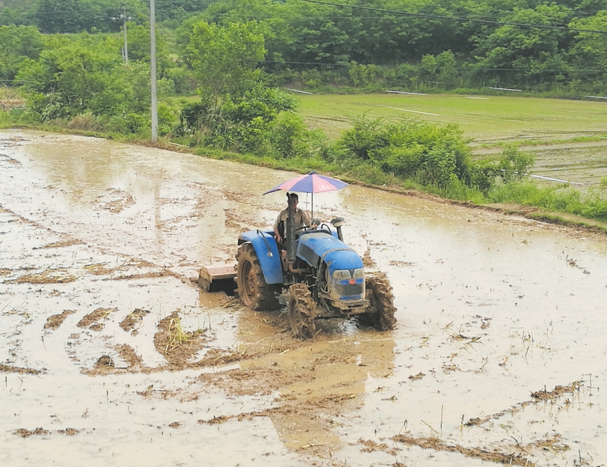 曾都区南郊办事处针对农村青壮年劳动力少的实际,在夏插夏种中,大力发挥农业机械的作用,做到插满种足不撂荒,确保粮食生产安全稳定。图为5月18日,该办事处凉亭村村民正在平整已收割的油菜籽田,准备插秧。(随州日报全媒记者 罗毅摄)