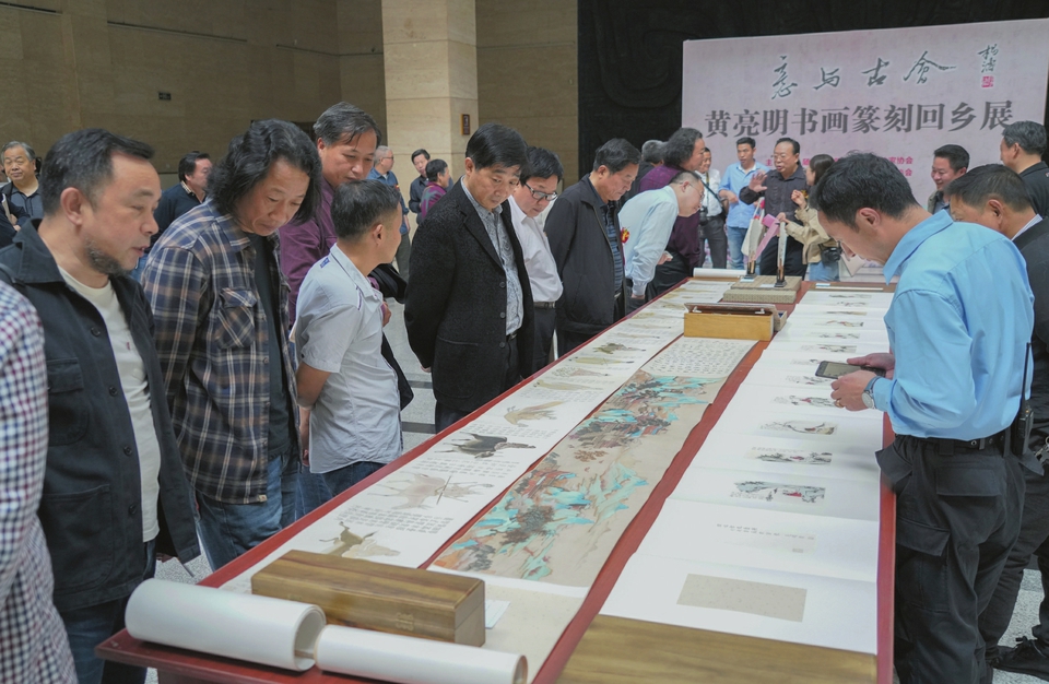 黄亮明书画篆刻回乡展日前在随州博物馆开展。展览展出了黄亮明近年来精心创作的60多幅书画篆刻作品,开展仪式上,来自北京的书画名家对展览给予了高度评价。黄亮明于2002年赴北京学习,多年来坚持不懈,终于学有所成,形成了自己清新典雅的艺术风格。(随州日报全媒记者 孙洪涛摄)