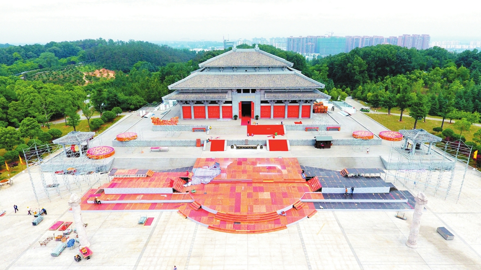 己亥年世界华人炎帝故里寻根节即将在随州举行,日前各项准备工作正在紧锣密鼓进行中。图为5月21日炎帝故里景区谒祖广场,工人们正在搭建拜祖大典的舞台。 (随州日报全媒记者 徐斌摄)