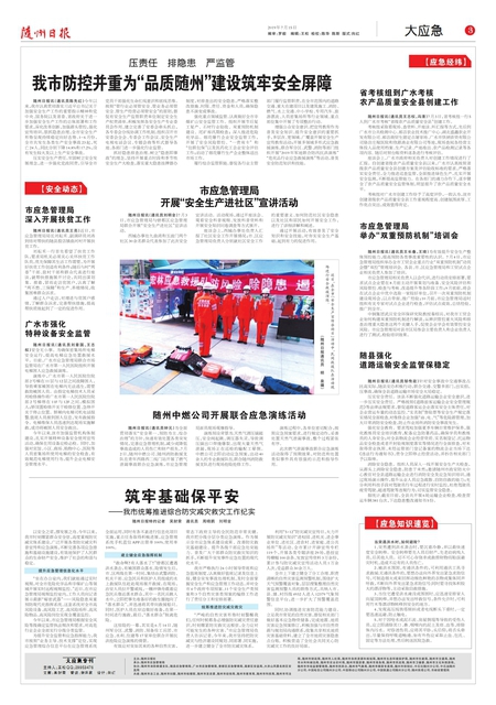 随州日报讯(通讯员陈先红)今年以来,我市认真贯彻落实习近平总书记关于加强安全生产工作的重要指示精神和党中央、国务院以及省委、省政府关于进一步加强安全生产工作的总体部署和工作要求,深化改革