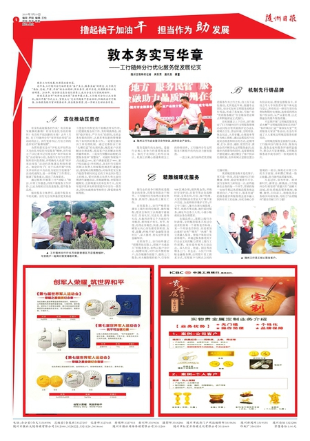 随州日报特约记者 吴财荣 通讯员 龚萱 服务立行促发展,优质高效谱新篇。 近年来,工行随州分行始终秉承“客户至上,服务至诚”的理念,大力践行“勤奋、忠诚、严谨、开拓”的企业精神,敦本