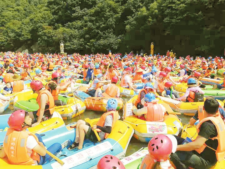 连日的高温催生“漂流热”,8月3日,西游记漂流景区接待游客近万人。图为起漂点的火爆场面。(随州日报全媒记者 冯家园摄)