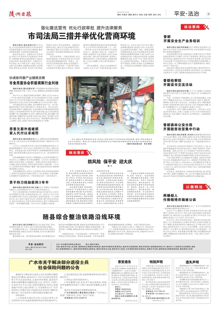 随州日报讯(通讯员郭小亮)今年以来,市司法局积极贯彻落实市委市政府优化营商环境要求,结合司法行政职能,整合法律服务要素,多举措优化营商环境。 强化普法宣传。加强涉企针对性普法,利用“3