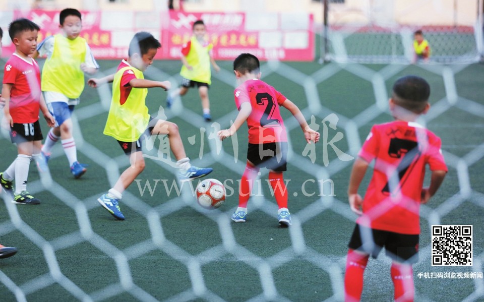 我市从2015年开始举办暑期足球夏令营,每年有100多名青少年参加,并呈增长趋势。图为8月24日,参加2019年足球夏令营的孩子们在结营典礼上的比赛瞬间。(随州日报全媒记者 徐斌摄)