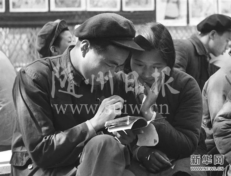 1953年3月22日,北京劳动人民文化宫举行宣传贯彻婚姻法游园大会。这是两名青年在观看宣传小册子。