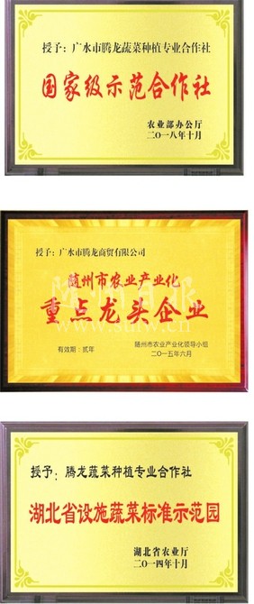 多年来,公司艰苦奋斗开拓创新,秉承“专业服务,缔造完美”的服务理念,博得了广大客户的信赖,也得到了各级领导的肯定,先后获得“随州市农业产业化重点龙头企业”“随州市农民专业合作社示范社”“湖北省农民专业合作社示范社”“湖北省设施蔬菜标准示范园”“农业部国家设施蔬菜标准示范园”等称号。