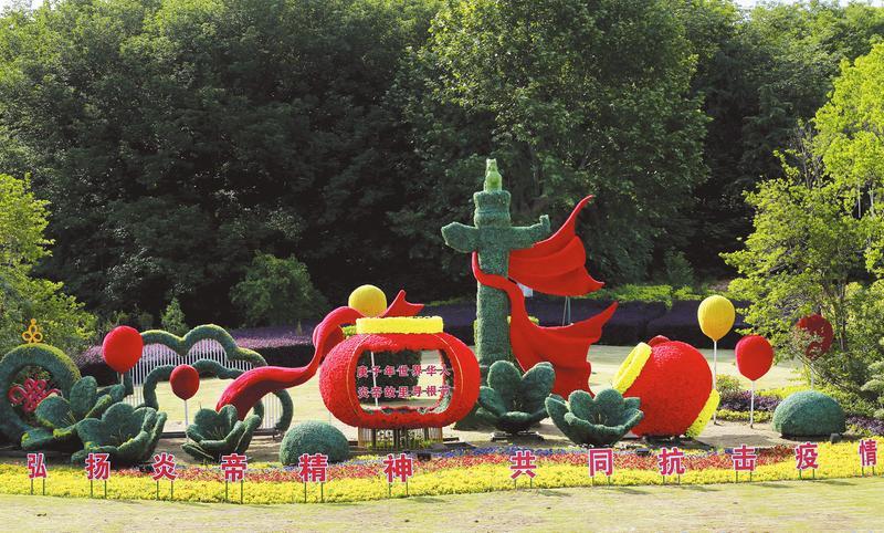 庚子年世界华人炎帝故里寻根节将于5月18日举行,迎宾花卉注入抗击疫情的新元素。图为市政府北山坡的迎宾花卉景观。(随州日报全媒记者徐斌摄)