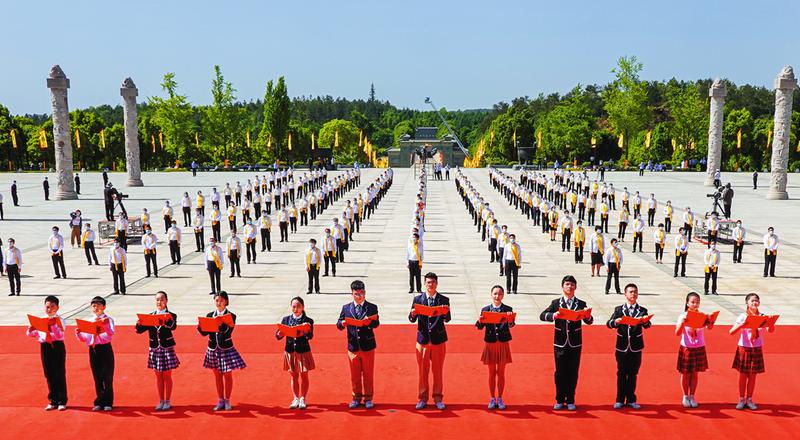 恭读颂祖文。炎帝故里优秀青少年学生代表恭读《颂炎帝文》。