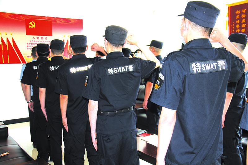在中国共产党的生日即将来临之际,市公安局特警支队第二党支部组织党员民警开展“主题党日”活动,集体重温入党誓词,坚定理想信念,增强党性观念。图为6月12日,民警集体重温入党誓词。 (随州日报通讯员刘智明尤琪摄)
