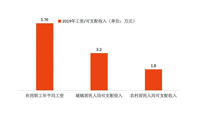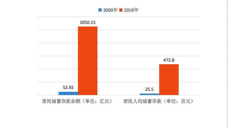 2019年,我市在岗职工年平均工资5.76万元,是2000年的10.2倍,年均增长13%。城镇和农村居民收入均实现倍增,城镇居民人均可支配收入3.2万元,是2000年的6.3倍,年均增长10.2%;农村居民人均可支配收入1.8万元,是2000年的7.7倍。2000年全市金融机构居民储蓄存款余额52.92亿元,2019年居民储蓄存款余额1050.15亿元,是2000年的近20倍。2000年随州居民人均储蓄存款2550元,2019年随州居民人均储蓄存款47280元,是2000年的18.5倍。