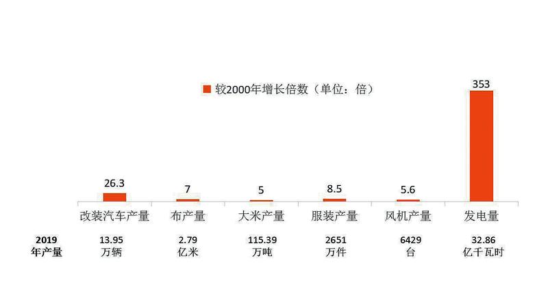 农业综合生产能力不断提升,主要农产品产量稳定增长。2019年粮食产量142.47万吨,年均增长0.6%;油料产量9.92万吨,年均增长3.6%;肉类总产量19.87万吨,年均增长2.4%;食用菌产量9.13万吨,年均增长13.5%。工业发展突飞猛进,主要工业产品产量成倍增长。2019年改装汽车产量13.95万辆,是2000年的26.3倍;布产量2.79亿米,是2000年的7倍;大米产量115.39万吨,是2000年的5倍;服装产量2651万件,是2000年的8.5倍;风机产量6429台,是2000年的5.6倍。全市发电量32.86亿千瓦时,是2000年的353倍。