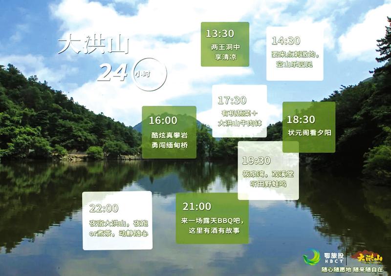 *大洪山旅游线路*游客中心—灵官垭—宝珠峰—南风垭—千年银杏广场(绿林山庄、洪山寺、剑口户外公园)—筱泉湾度假村—两王洞—状元台—白龙池—灵官垭—游客中心(空山乐园)。
