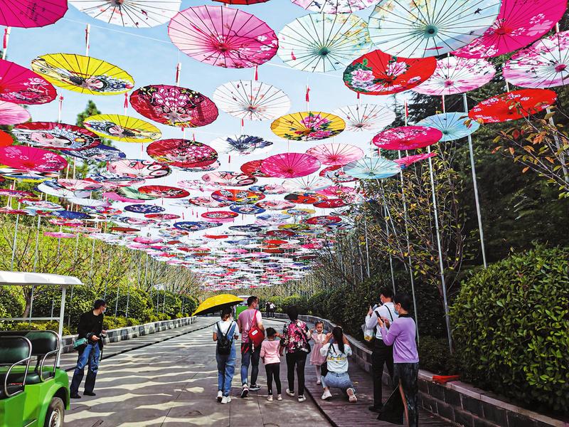图①:炎帝故里景区南门入口处,“姹紫嫣红”油纸伞长廊吸引了众多游客。(随州日报全媒记者李文军、通讯员朱小龙摄)