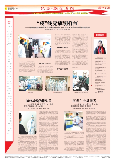 门诊部是抗疫战场的前沿阵地。疫情防控阻击战打响以后,曾都医院门诊部副主任钱小松坚守阵地,毫不松懈,构筑了一道牢固的抗疫防控线。