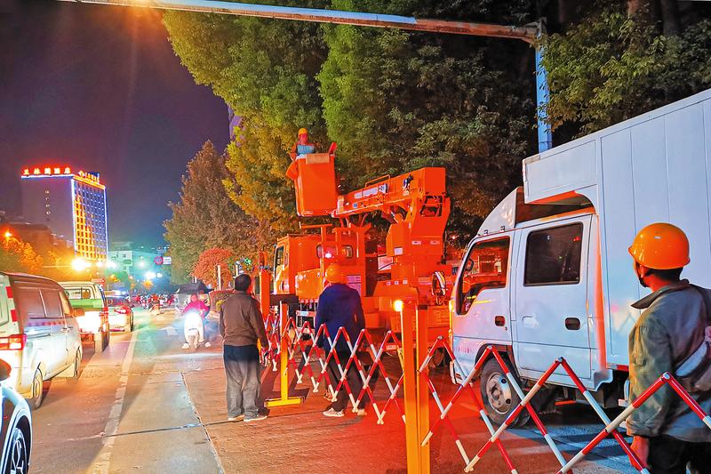 10月10日晚9时左右,随城舜井大道与汉东路红绿灯路口附近变压器发火烧毁,导致该台区多家单位和数万居民家停电,随州供电公司高新区供电中心立即组织人员进行抢修,历经近2个小时奋战恢复供电。图为电力工人正在高空抢修变压器。 (随州日报全媒记者李文军摄)
