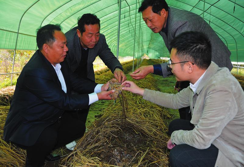 市食用菌协会日前组织专家组到随县淮河镇艺博酒红菇高产出口创汇种植示范基地,指导养菌期温度、湿度、通风、透光、增氧等科学管理。图为基地负责人介绍情况。(随州日报通讯员石守京摄)