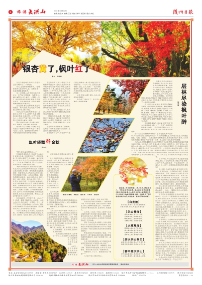 如果说大洪山的春天花枝招展,那么大洪山的秋天真可谓色彩斑斓。我喜欢大洪山的春天,更欣赏大洪山的秋色,因为只有进入深秋时节,大洪山像过节日般的喜庆,层林尽染,五彩缤纷,交相辉映。红彤彤的枫树,黄灿灿的银杏树,褐黄色的栎树,青绿色的松树,加上不同色彩的零星杂树,构成了一幅浓艳的油画。