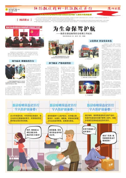 榜样就是引领,标杆即是旗帜。为深度宣传全市抗击新冠肺炎疫情先进集体的典型事迹,鼓舞全市人民积极夺取疫情防控和经济社会发展“双胜利”,随州日报组织开展“弘扬抗疫精神致敬抗疫英雄——与‘全市抗击新冠肺炎疫情先进集体’面对面”专题宣传。今日刊发的是随县交通运输局抗击疫情工作纪实,敬请读者关注。