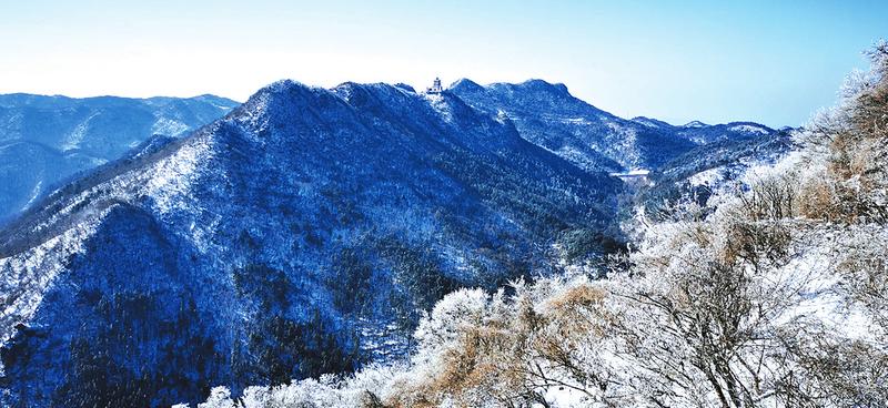 金顶上的一切都被白色笼罩。最有气魄和魅力的是雪凇。雪凇是大洪山特有的白色花朵,是雪的杰作,也是高山湿气的杰作,是温湿与冷空气的幸福结合。树干上、枝条上、石头上、墙头上、房檐上、路灯上,甚至悬挂在屋檐下的佛铃上,都被雪凇打扮得美轮美奂,不仔细瞧,以为是春天里满山遍野的樱花、梨花。金顶上的雪凇,生命十分强悍,只要够冷,绽放的时间长达一个月之久,没有矫情,只有粗犷;没有弱小,只有一腔平凡与博大的胸怀。