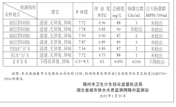 湖北省城市供水水质监测网随州监测站、随州市卫生计生综合监督执法局根据《城市供水水质管理规定》联合于2021年1月11日对市玉龙供水有限公司先觉庙水厂出厂水和12个管网末稍水水质进行了抽样监测,现将抽查检测结果公告如下: