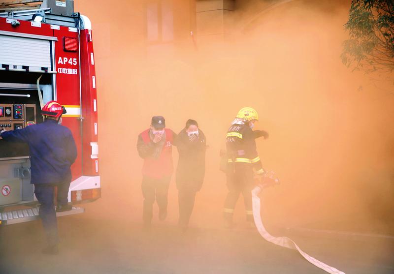 1月28日下午,随州消防出动3台消防车、20多名消防员,在城南新区云海天地小区联合物业开展消防应急演练,提高广大业主的消防安全意识,加强对火灾扑救工作的组织和处理能力。图为演练中物业人员协助居民撤离。 (随州日报全媒记者徐斌摄)