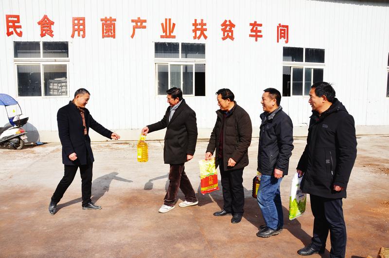 1月29日,市食用菌协会工作人员到曾都区洛阳镇随州市九口堰富民蘑菇农民专业合作社,慰问刚刚获得全国劳动模范殊荣的合作社理事长严贤涛(左一),鼓励他保持荣誉,开拓创新,新年迈新步,继续做大、做强、做优食用菌产业,造福随州人民。(随州日报通讯员石守京摄)