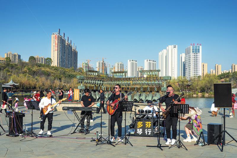 近日 ,春暖花开,市民纷纷走出家门来到公园放风筝、赏花,感受春天的气息。图为多芬琴行正在随州文化公园举行音乐会,吸引了许多游人驻足欣赏。 (随州日报全媒记 者李文军摄)