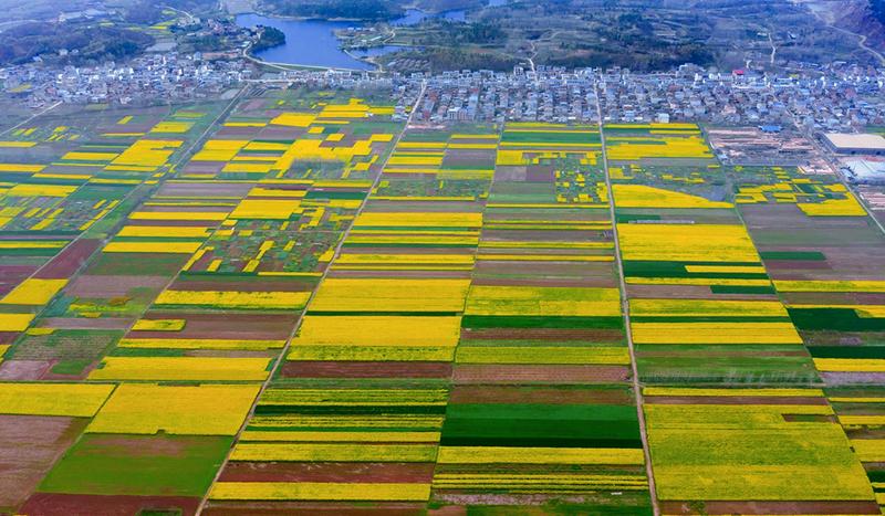 阳春三月,随州高新区淅河镇金屯村的油菜花次第盛开,形成了蔚为壮观的花海,片片金色涟漪,映衬着四周的阡陌、屋宇和山丘,让人宛若置身画卷之中。(随州日报通讯员杨峰摄)
